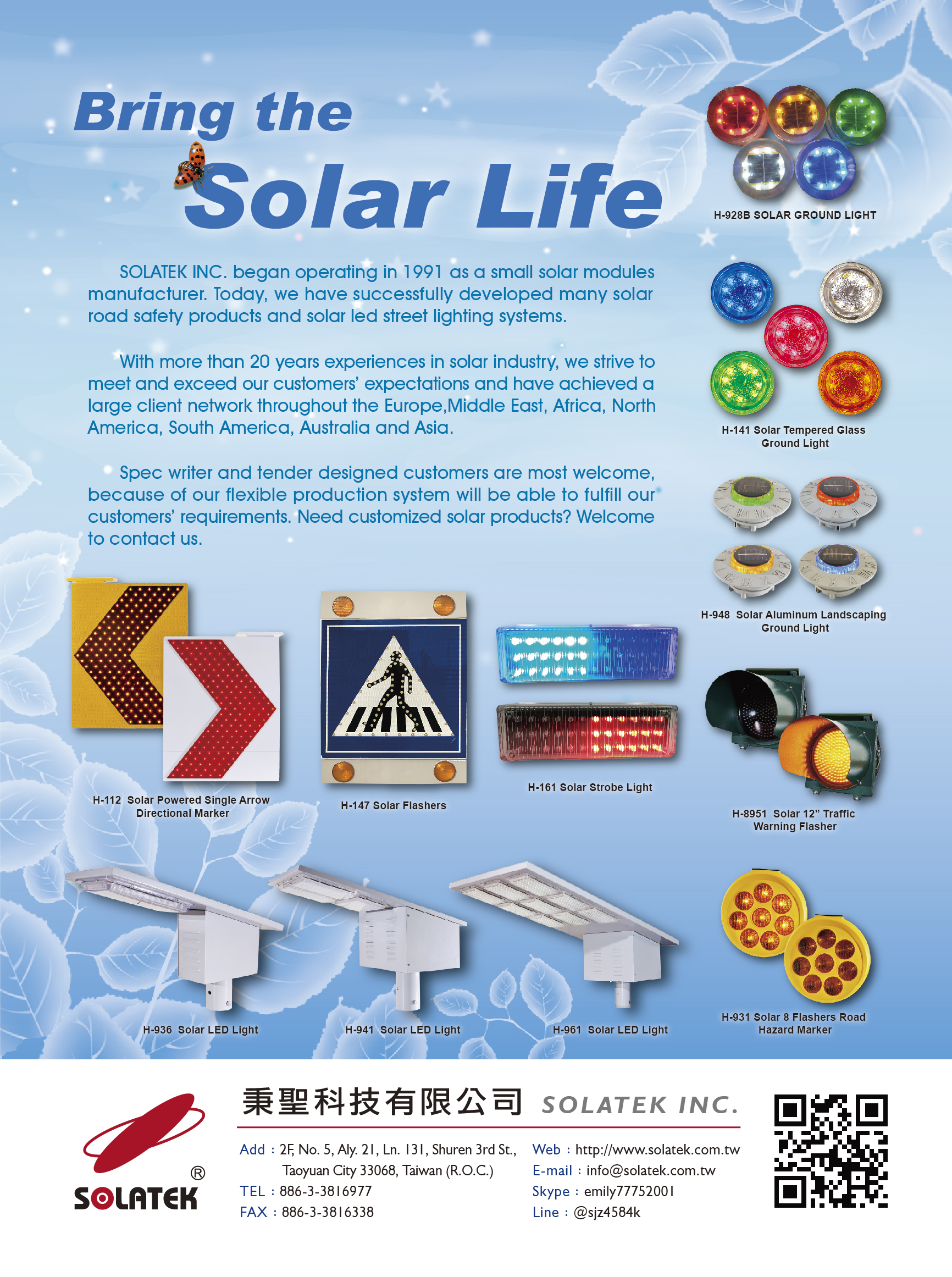 TEL: 886-3-3816977 FAX: 886-3-3672851 Email: info@solatek.com.tw