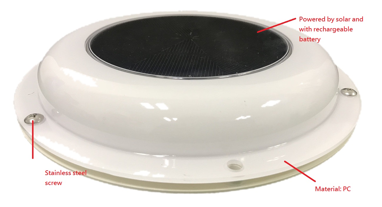 7.(without battery versiom) Fully powered by solar energy, extremely quiet and water resistant. It's only working at daytime and if there's a shadow cover the solar panel then the solar vent will stop working and will spin again when the sunlight comes back.